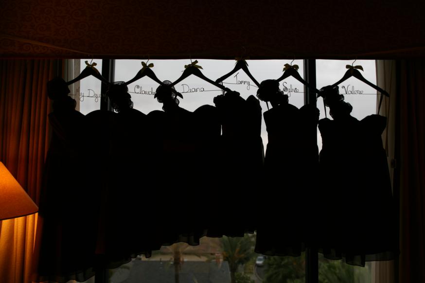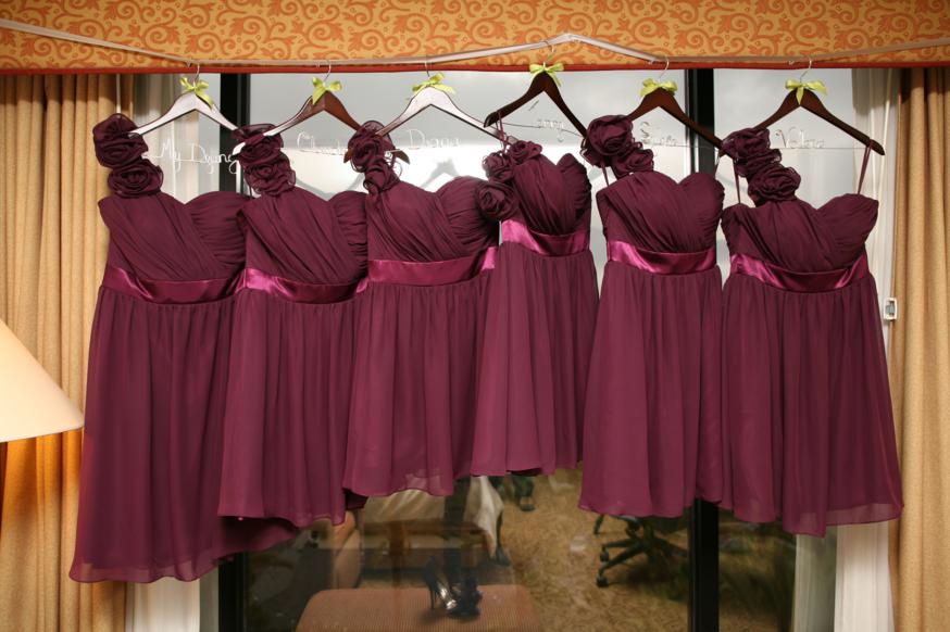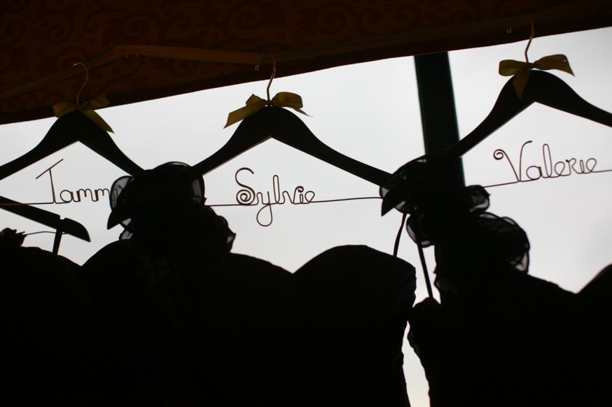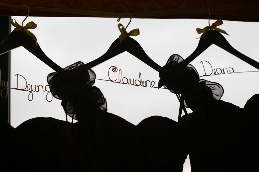 The bridesmaids dresses…each with their own personalized hanger.