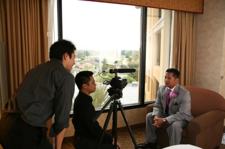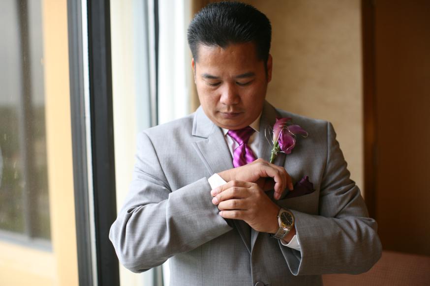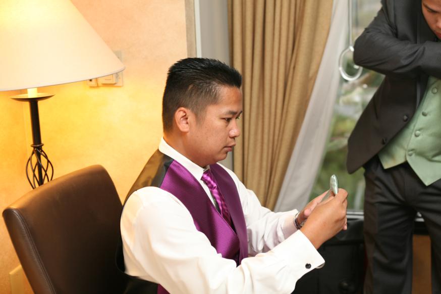 I think this is the moment when Renrick found out about the suit crisis. Apparently, 1 of the groomsman suit color didn’t match everyone else’s. His suit was a lighter grey! They decided to switch suit while trying to call the tuxedo place to resolve it. In the end, it worked out for me because I’ve wanted Renrick to wear a light grey suit to begin with while the groomsmen were to be in the dark grey. :)